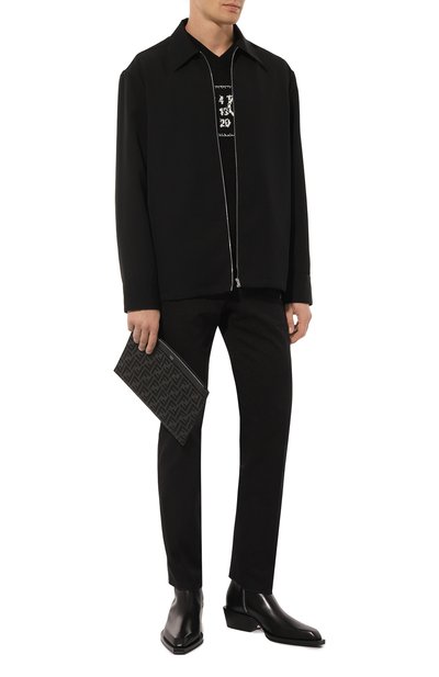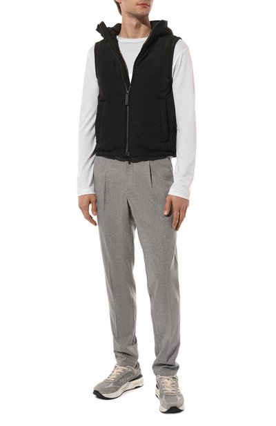 Жилет с глубоким V-образным вырезом связали из шерстяной пряжи. Эластичную модель в рубчик украсили фирменной вертикальной полосой сзади.