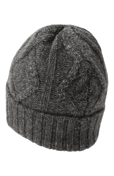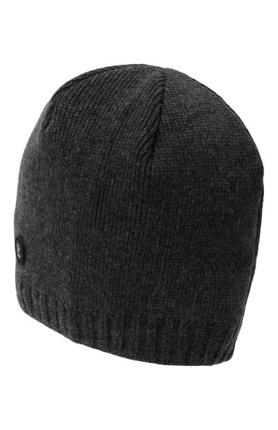Шапку бини связали из хлопковой пряжи с добавлением шерсти и кашемира. Меланжевую модель украсили вышитыми логотипом и фирменным слэшем на широком отвороте.