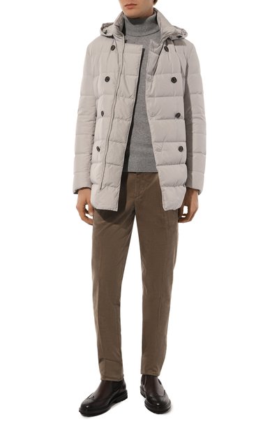 Куртку на гусином пуху выполнили из влагоотталкивающего и ветрозащитного полиэстера Gore-Tex Infinium. Модель с молнией, скрытой под штормовой планкой на пуговицах, дополнили съемной манишкой с регулируемым капюшоном. Помимо нагрудного и боковых карманов предусмотрели еще один внутренний.