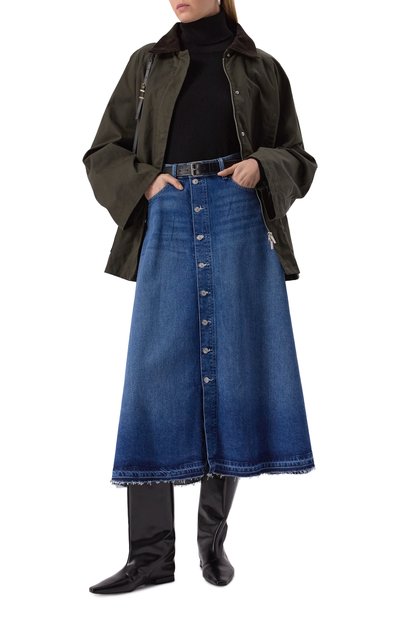 Выбеленную юбку-карандаш с брендированным жакроном сзади выполнили из ароматизированного переработанного хлопка плотностью 13 унций. Самый маленький из пяти карманов модели украсили ярлыком с фирменной эмблемой.