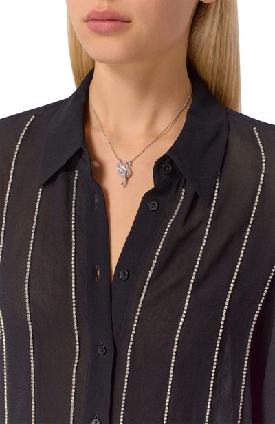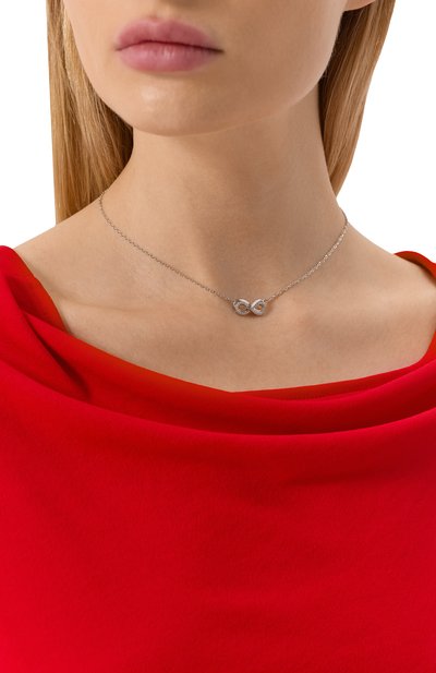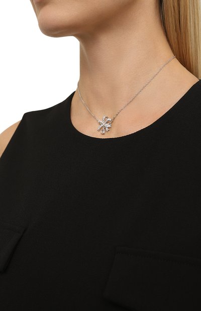 Подвеску Matrix на цепочке якорного плетения выполнили из латуни с гальваническим покрытием родием. Аксессуар в форме узла инкрустировали прозрачными циркониями багетной огранки.