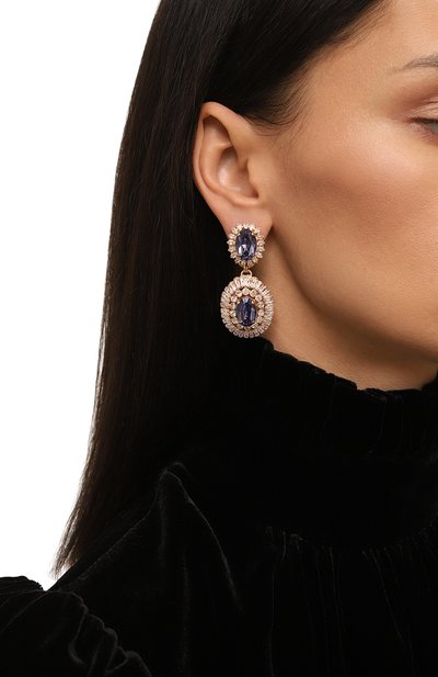 Серьги Constella с застежкой-пусетой выполнили из латуни, нержавеющей стали и титана. Модель с фигурной подвеской декорировали кристаллами и цирконием.