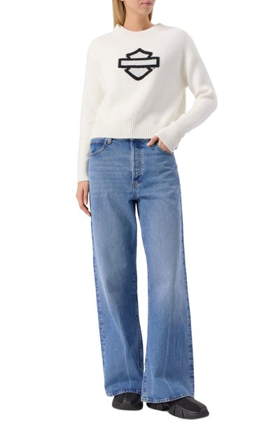 Свитер Nitra с манжетами, поясом и круглой горловиной в рубчик украсили контрастным жаккардовым изображением. Модель связали из пряжи на основе шерсти овцы и альпака.