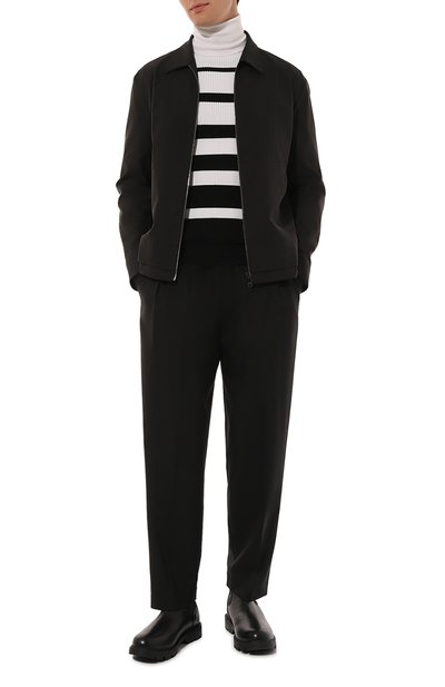 Двухцветную водолазку Olympics edition связали из шерстяной пряжи. Спереди модель с высоким воротом в рубчик украсили жаккардовыми надписями Milano и Cortina, а снизу – нашивкой с символикой О лимпийских игр 2026 года.