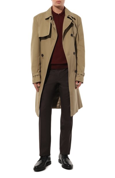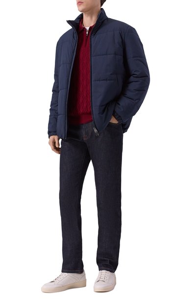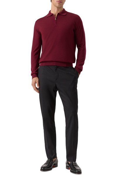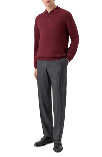 Поло в фактурную вертикальную полоску выполнили из тонкого шерстяного трикотажа. Линию плеч, воротник, эластичные манжеты и пояс подчеркнули контрастными линиями. С ними перекликаются внутренняя сторона пуговичной планки и вышитая эмблема Royal Eagle на спинке.