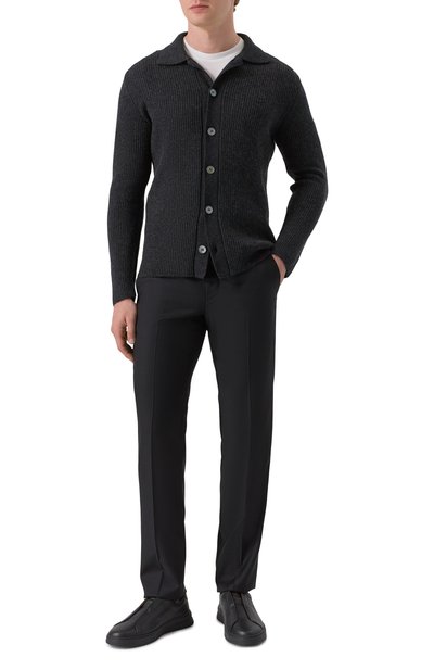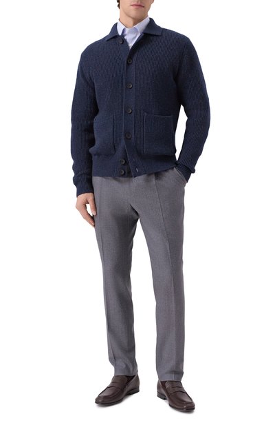 Короткий кардиган связали из ворсистой пряжи на основе шерсти альпака и мериноса с добавлением нейлона. Изделие застегивается пуговицами в тон.