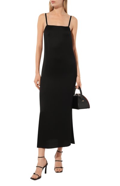 Платье с регулируемыми бретелями сшили из вискозы с геометрическим принтом. Модель прямого кроя застегивается обтяжными пуговицами спереди.