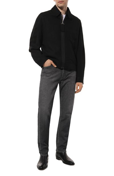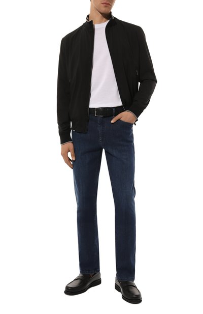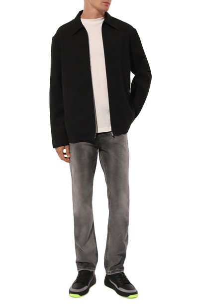 Джинсы свободного кроя сшили из плотного хлопкового денима с мраморным эффектом. Модель с высокой посадкой дополнили пятью карманами и брендированным патчем на поясе.