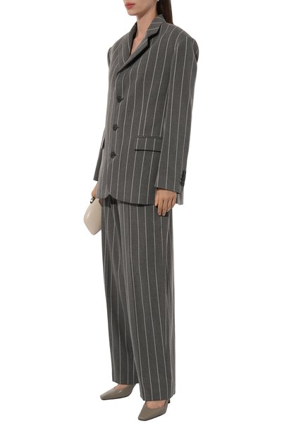 Брюки с высокой посадкой сшили из ткани купро в вертикальную полоску. Модель с широкими брючинами дополнили боковыми и задними прорезными карманами.