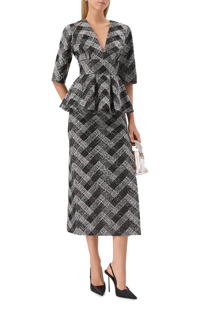Юбку с анималистическим узором сшили из ворсистого жаккарда на основе шерсти и руна альпака с добавлением синтетических нитей. Модель с вискозной подкладкой застегивается потайной молнией сзади.