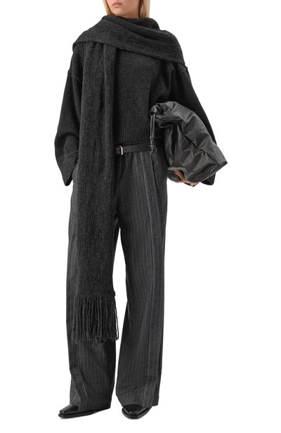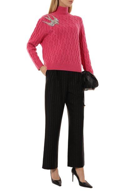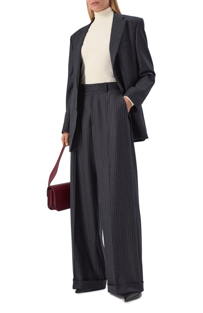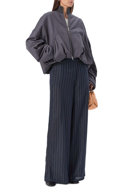 Брюки кроя Loose fit сшили из жатого купро в вертикальную полоску. Модель с высокой посадкой дополнили боковыми и задними карманами.