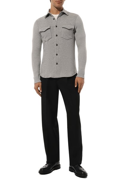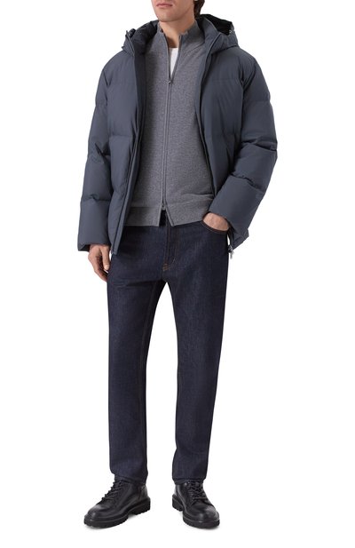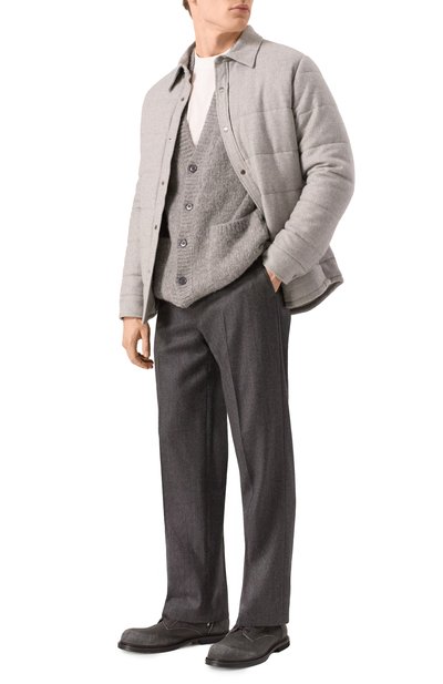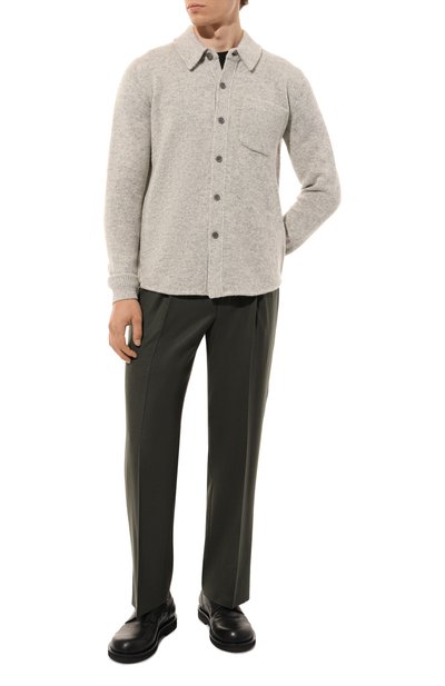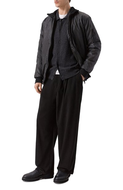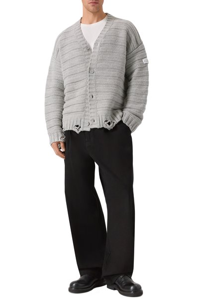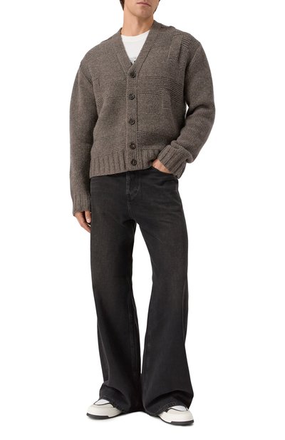 Кардиган с отложным воротником связали из пушистой пряжи, сочетающей шерсть овцы и альпака. Модель с отделкой в рубчик застегивается контрастными пуговицами.