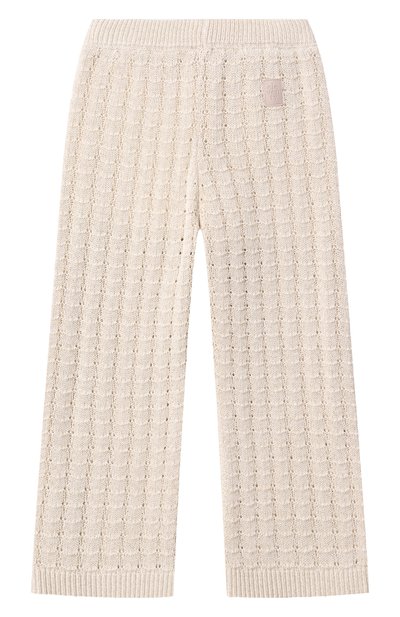 Брюки, представленные эксклюзивно в ЦУМе, сшили из кашемирового трикотажа с рельефным узором. Модель дополнили широким эластичным поясом в рубчик.