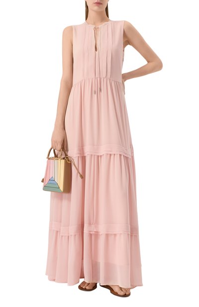 Лиф миди-платья Samuele выполнили из тонкого джерси на основе лиоцелла и вискозы, а плиссированный подол – из полиэстерового атласа. Модель с пуговицей сзади дополнили поясом-лентой, который можно завязывать разными способами.