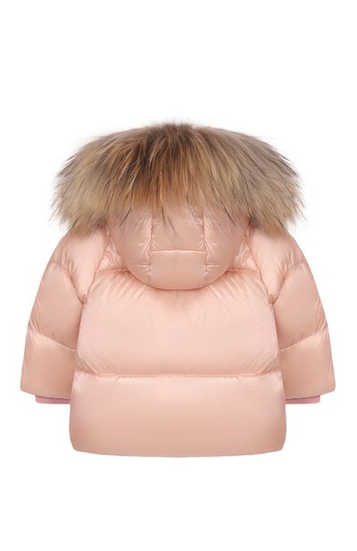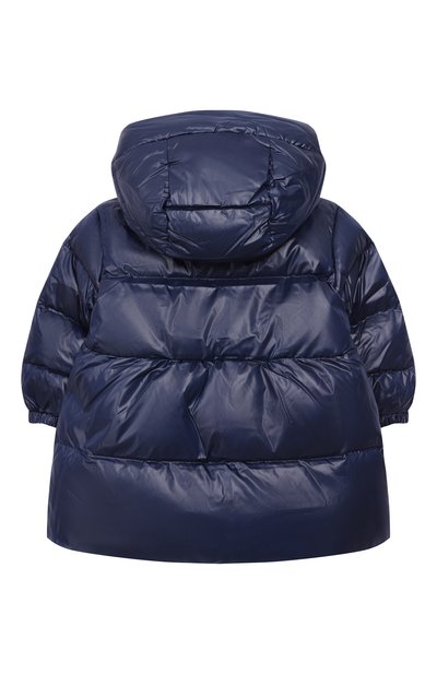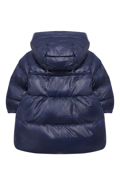 Стеганую куртку на утином пуху выполнили из нейлона, предусмотрев хлопковый подклад. Пуховик с двумя боковыми карманами дополнили капюшоном, украшенным вставками-ушками.