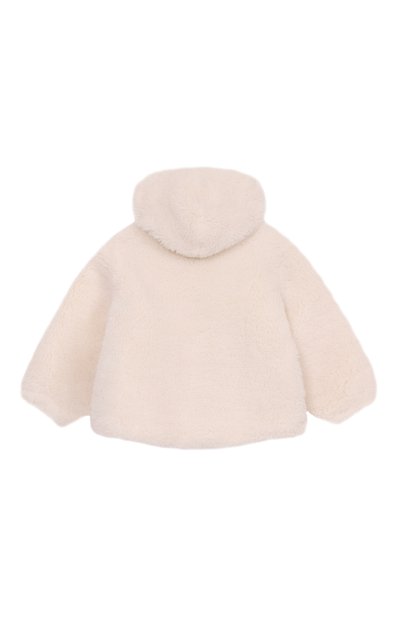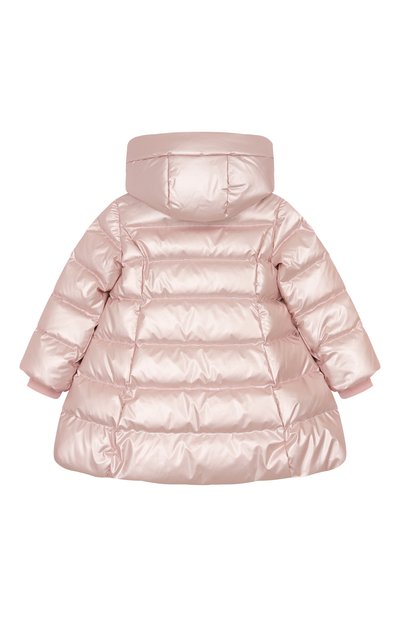 Стеганую куртку на утином пуху выполнили из нейлона, предусмотрев хлопковый подклад. Пуховик с двумя боковыми карманами дополнили капюшоном, украшенным вставками-ушками.
