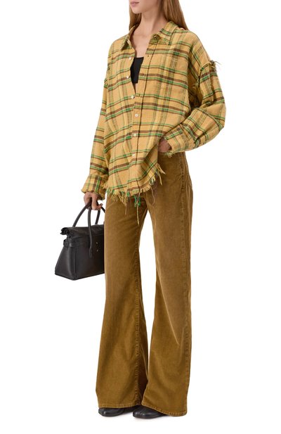 Клетчатую рубашку Diana с потертостями и рваной бахромой на узнаваемом асимметричном низе выполнили из неравномерно выбеленной хлопковой фланели. Спереди изделие украсили вышитым логотипом марки.
