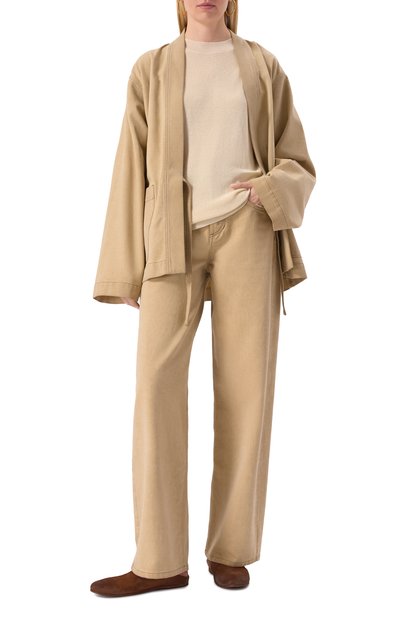 Широкие расклешенные джинсы Siamese с пятью карманами выполнили из неэластичного денима. Окрашенную в готовом виде модель декорировали брендированным патчем на поясе и серебристой S-образной деталью на одной из шлевок.