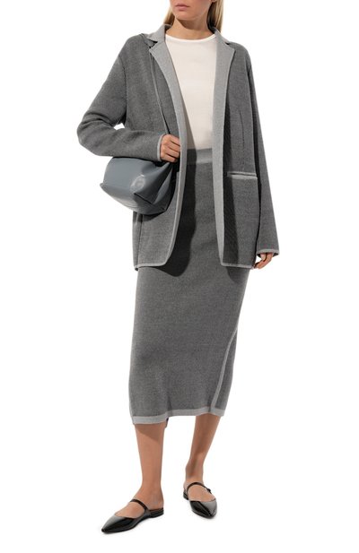 Мини-юбку в рубчик выполнили из шерстяного трикотажа с добавлением кашемира. Модель с высокой посадкой и широким поясом застегивается молнией с фирменным пуллером.