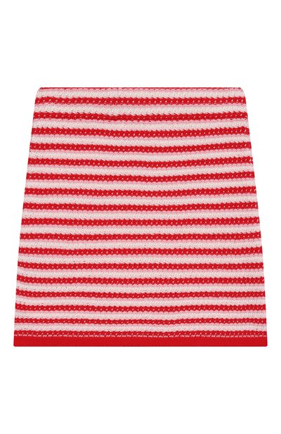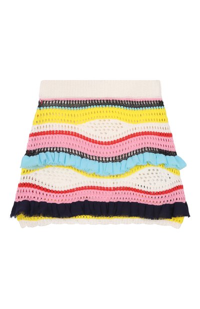 Юбку Delma с ажурными узорами и трехцветными полосками связали из мягкой хлопковой пряжи. Край подола подчеркнули узким однотонным кантом.