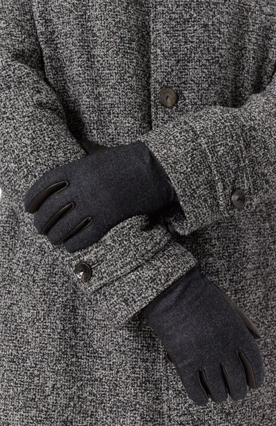 Тыльную сторону перчаток выполнили из шерстяного трикотажа, а ладонную – из гладкой кожи. Из нее же изготовили короткий ремешок с кнопкой на ребристой манжете.