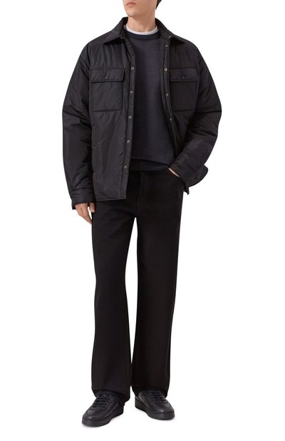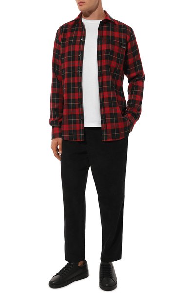 Кеды с внутренней отделкой из овчины выполнили из зернистой кожи. Модель с тисненым логотипом марки на язычке и заклепкой на заднике установили на широкую подошву в тон.