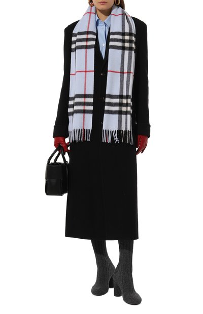Шарф с мотив ом Burberry Check украсили короткой бахромой по краям и контрастной нашивкой с логотипом. Аксессуар изготовили из тонкой шерсти.