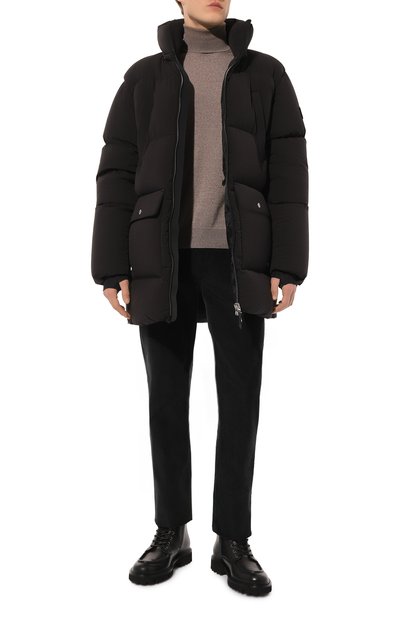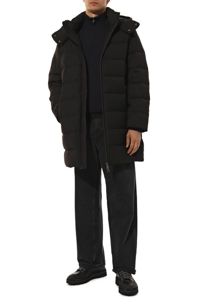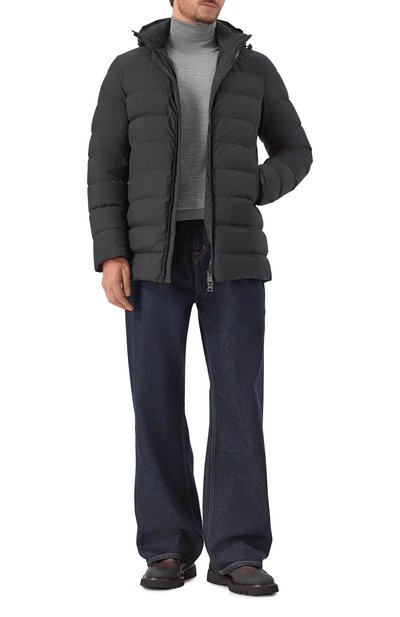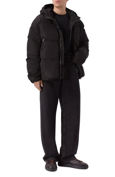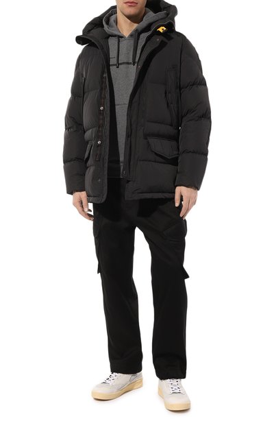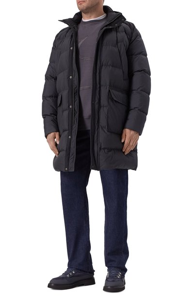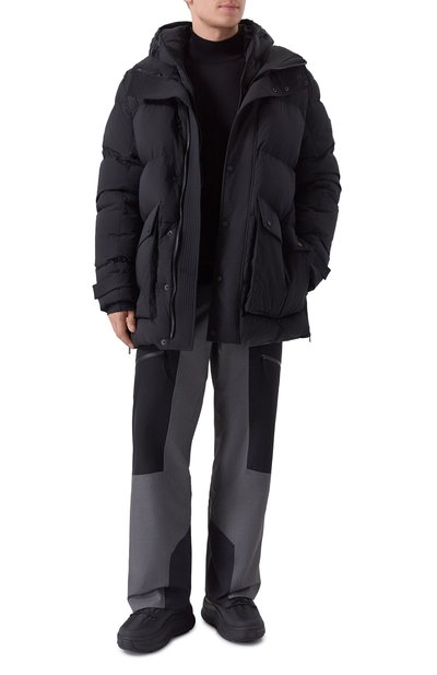 Утепленную куртку с капюшоном выполнили из полиамида. Снизу предусмотрели потайную кулиску и две декоративные шлевки. Пуховик, как и боковые карманы, застегивается контрастной молнией.
