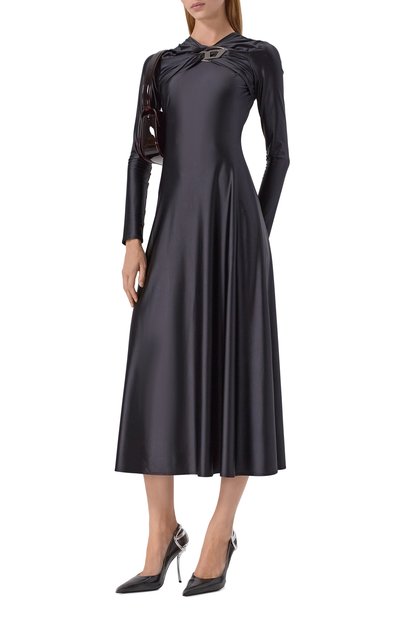 Платье с высоким воротом выполнили из стрейчевого трикотажа на основе модала. Модель с рельефным швом спереди дополнили фирменными ниспадающими нитями на манжетах.