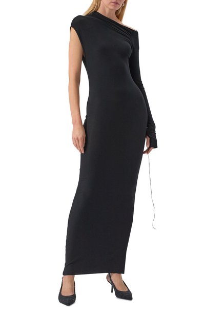 Платье с высоким воротом выполнили и з стрейчевого трикотажа на основе модала. Модель с рельефным швом спереди дополнили фирменными ниспадающими нитями на манжетах.