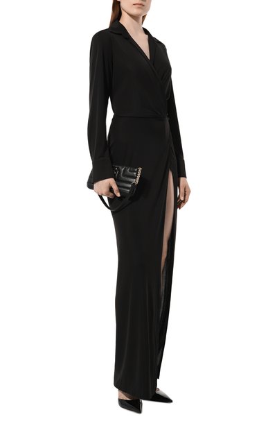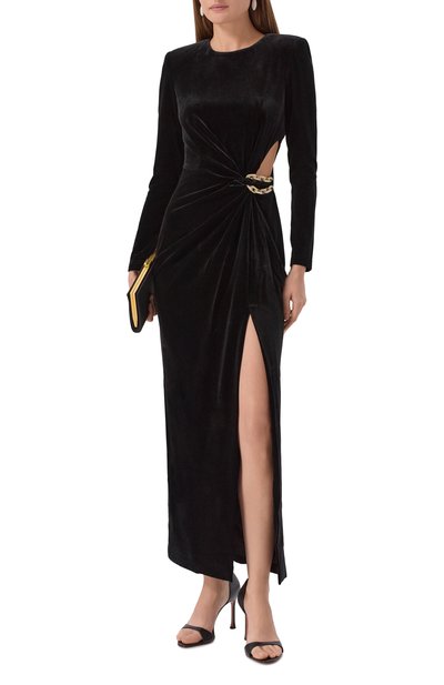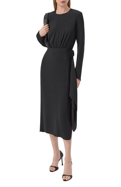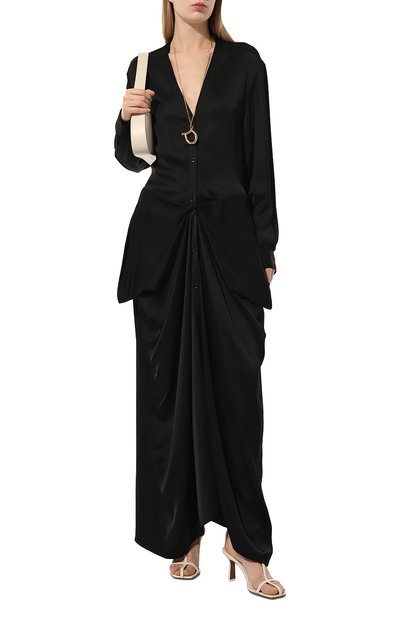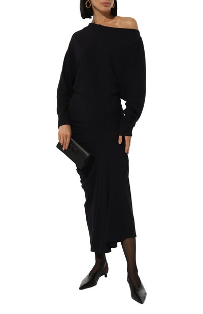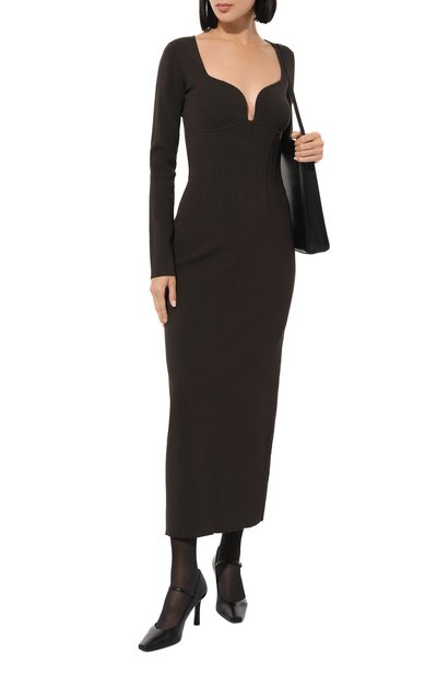 Макси-платье с длинными нитями на манжетах-митенках сшили из эластичного модала в рубчик. Лиф с асимметричным вырезом, подчеркнутым драпировкой, дополнили ниспадающей деталью.