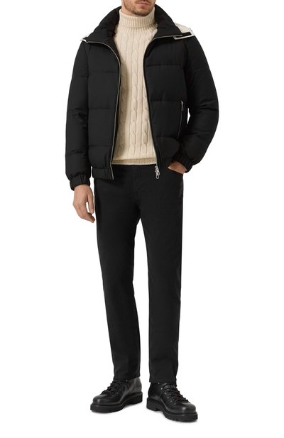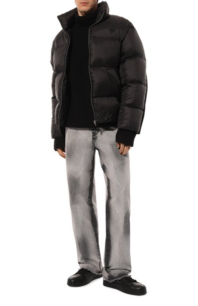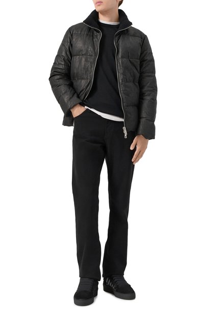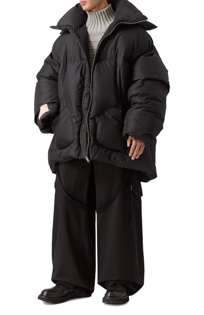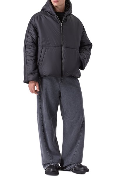 Утепленную куртку из нейлона дополнили трикотажными манжетами. Сквозь кулиску капюшона пропустили длинный шнур в тон, а по бокам предусмотрели врезные карманы с листочками. Модель с подкладом из чистого хлопка застегивается контрастной встречной молни ей.