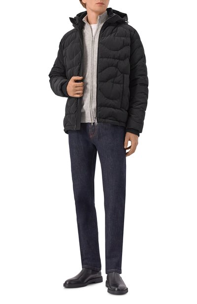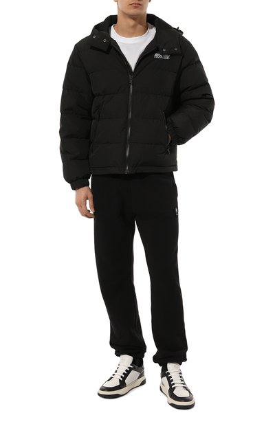 Утепленную куртку из нейлона дополнили трикотажными манжетами. Сквозь кулиску капюшона пропустили длинный шнур в тон, а по бокам предусмотрели врезные карманы с листочками. Модель с подкладом из чистого хлопка застегивается контрастной встречной молнией.