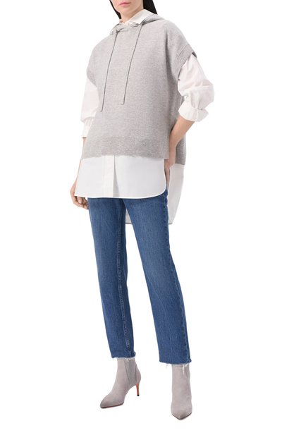 Жилет с боковыми разрезами выполнили ребристой вязкой из шерсти с добавлением кашемира. Модель с отворотом на высокой горловине дополнили съемным поясом-лентой.