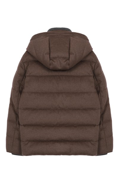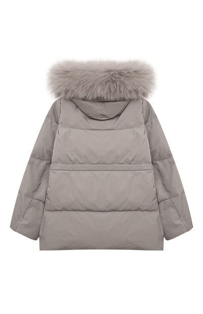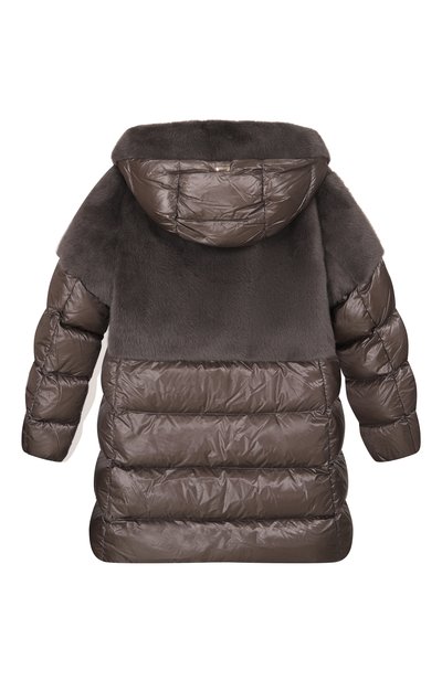 Стеганую куртку на утином пуху выполнили из нейлона, а отстегивающуюся опушку на съемном капюшоне изготовили из меха ягненка. Модель на молнии дополнили штормовой планкой и двумя карманами на кнопках.