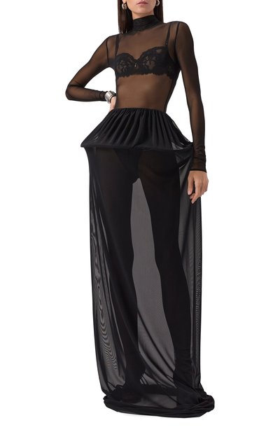 Длинную юбку выполнили из хлопкового бархата, дополнив изделие широкой вставкой из тюля с цветочным мотивом. Сзади у модели предусмотрели шлицу и потайную молнию.