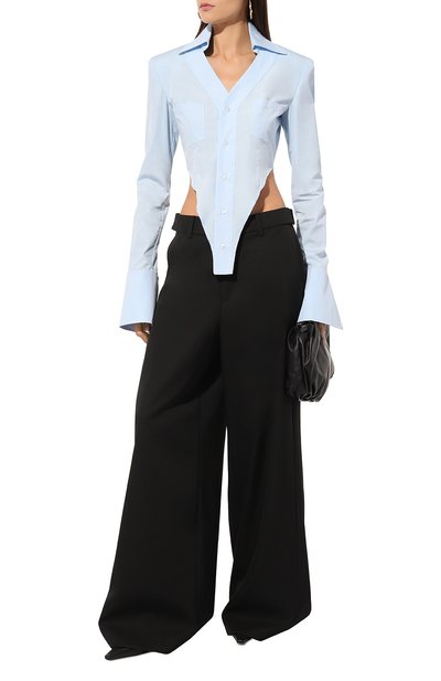 Широкие брюки с высокой посадкой и стрелками сшили из шерстяного габардина. Однотонная модель с двумя врезными карманами застегивается потайной молнией сзади.
