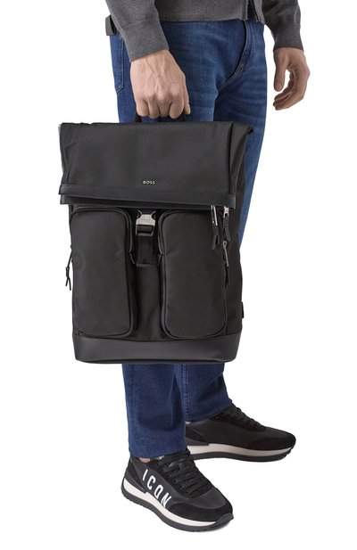 Рюкзак Zair с плотной текстильной спинкой выполнили из тисненой регенерированной кожи. Основное отделение, внутренний и внешний карманы аксессуара с логотипом спереди закрываются молниями.