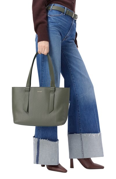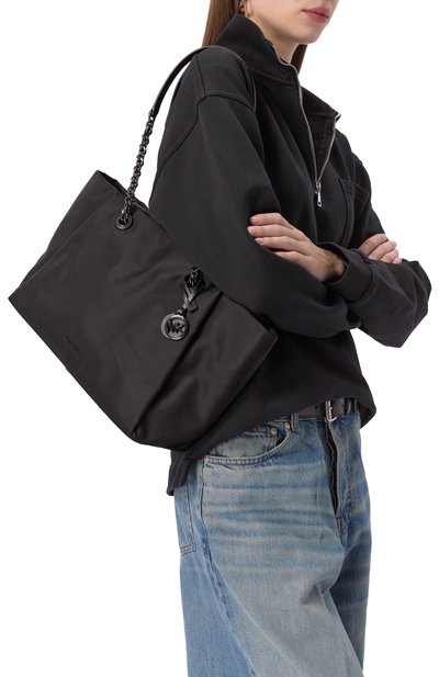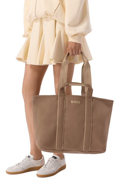 Сумку-тоут Palmah с логотипом марки спереди сшили из ворсистого переработанного полиэстера, дополнив изделие двумя парами ручек, одни из которых – брендированные. Модель с внутренним карманом застегивается карабином.