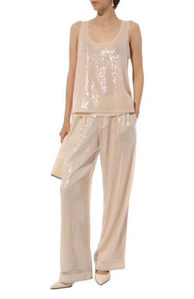 Брюки Tilloi с атласным эластичным поясом дополнили боковыми карманами. Широку ю модель изготовили из эластичного полиэстера, полностью расшитого пайетками.
