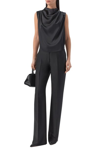 Укороченный топ с драпировкой спереди выполнили из стрейчевого полиэстерового атласа с россыпью граненых стразов. Модель застегивается потайной молнией с пуллером-эмблемой сзади.