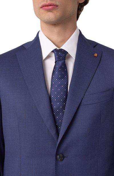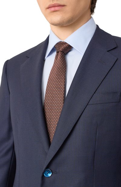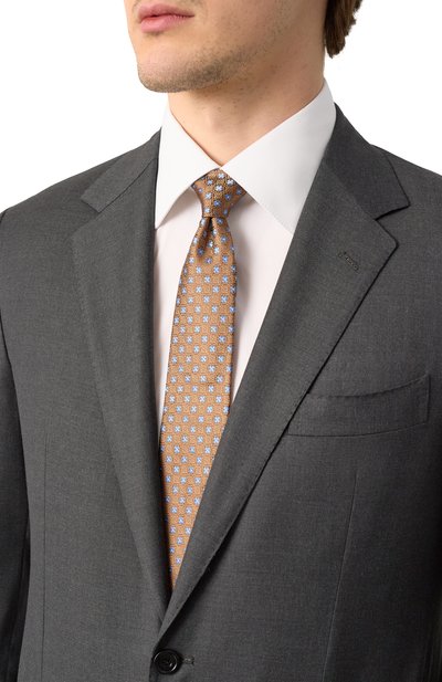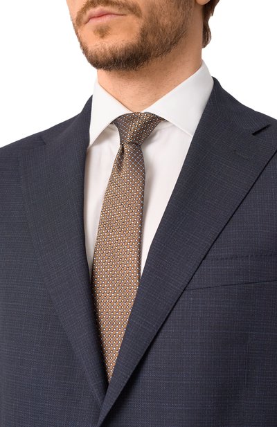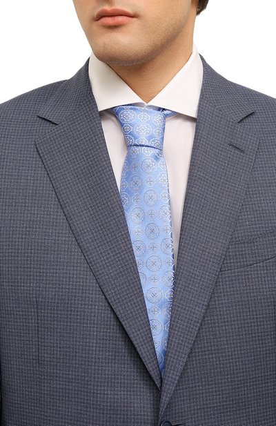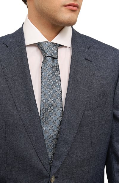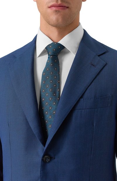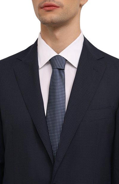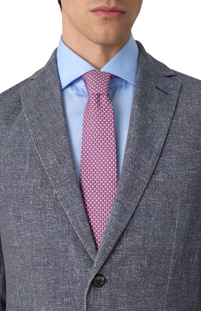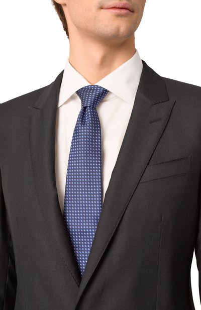 Галстук с графичным мотивом выполнили из шелка с добавлением полиэстера. Чтобы изделие не перекручивалось, детали соединили эластичным ручным швом.
