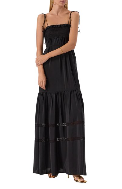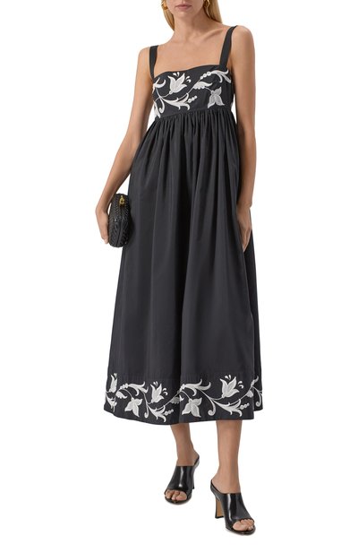 Приталенное миди-платье Hypnotic из микса льна и шелка дополнили съемным поясом с бантом. Расклешенный подол и облегающий лиф с бюсками и чашками на косточках украсили цветочным кружевом в тон. Модель с двумя карманами в боковых швах застегивается потайной молнией сзади.