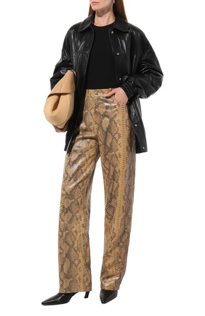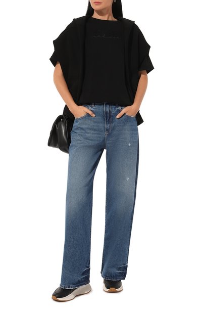 Для пошива футболки с приспущенной линией плеч использовали хлопковое джерси. Спереди модель украсили контрастной надписью, которой вторит принт сзади.