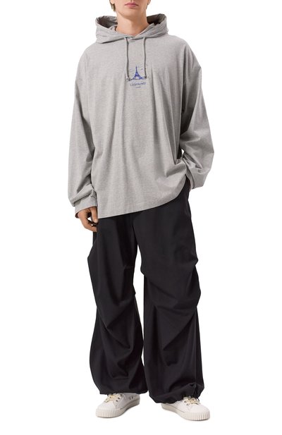 Худи силуэта oversize сшили из хлопкового трикотажа. Модель с регулируемым капюшоном и двумя врезными карманами на молниях украсили принтом в виде обложки музыкального альбома дуэта Moebius & Plank.