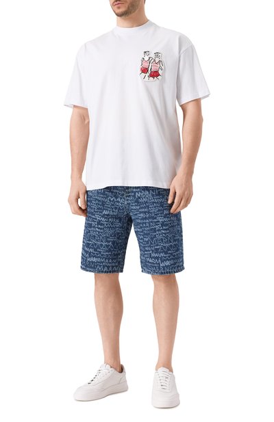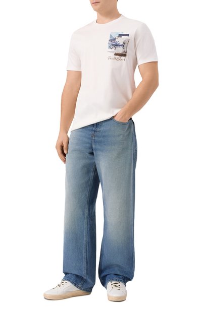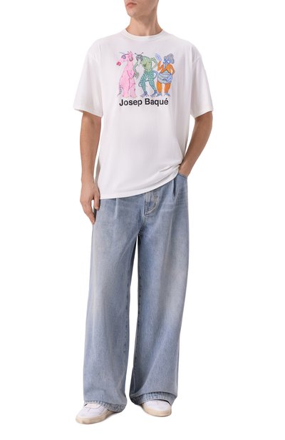 Футболку силуэта oversize выполнили из хлопкового джерси. Спереди модель декорировали мотивом в виде обложки альбома Rastakraut Pasta немецкого дуэта электронной музыки Moebius & Plank, а на спинке – фотопринтом.