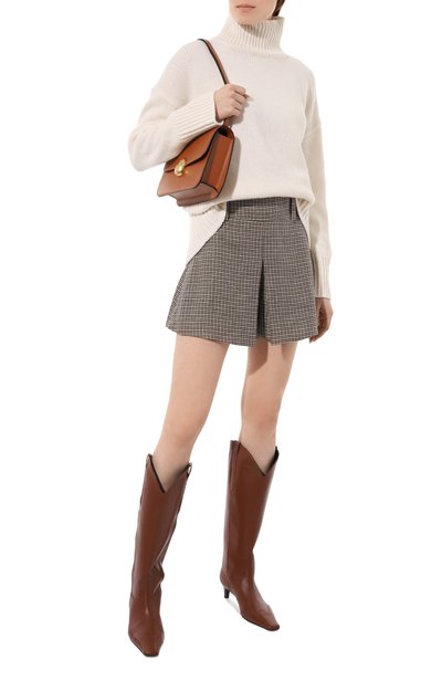 Для пошива мини-юбки А-силуэта использовали полушерстяной твид с добавлением хлопка и вискозы. Модель застегивается молнией сзади.
