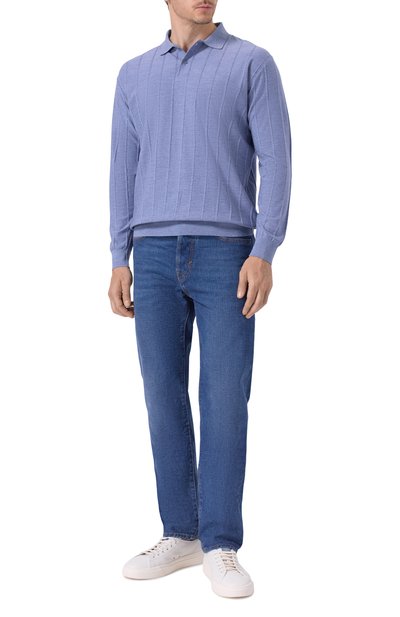 Джинсы свободного кроя сшили из чистого хлопка, слегка выбелив готовую модель. Пять карманов дополнили декоративными потертостями по краям, подчеркнув правый задний фирменной двухслойной пластиной.