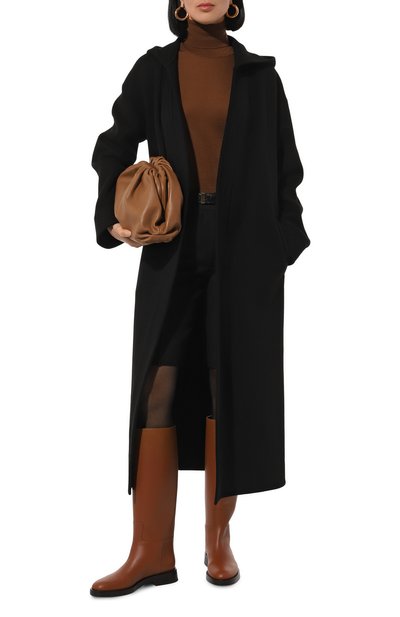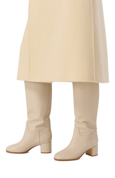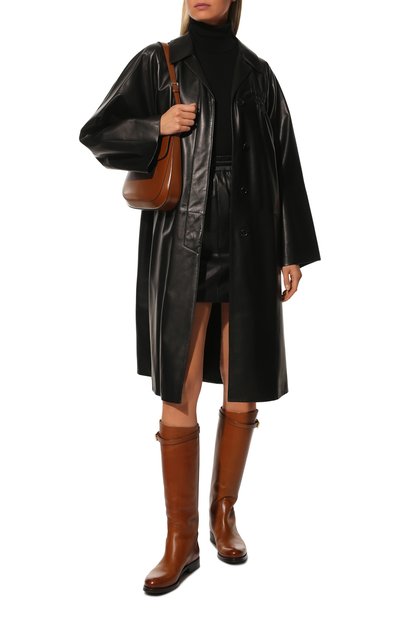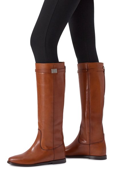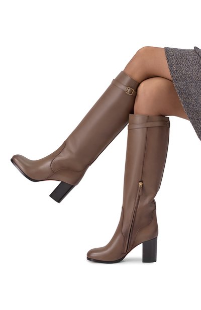 Сапоги на устойчивом каблуке, вдохновленные обувью для верховой езды, изготовили из телячьей кожи. Модель украсили узким ремешком с выгравированной литерой F на металлической пряжке.