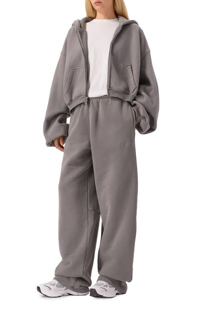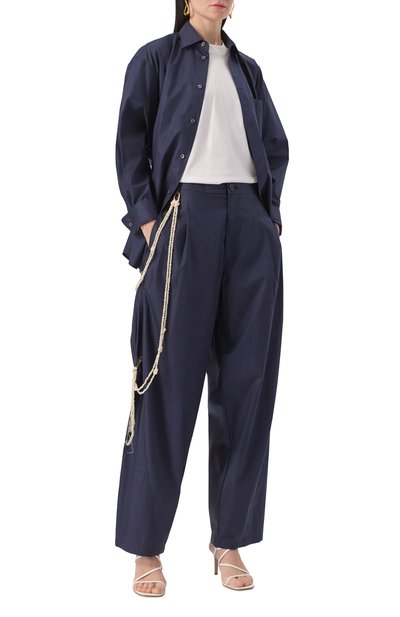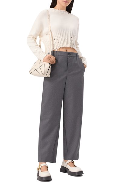 Брюки с регулируемым поясом-кулиской выполнили из жатого хлопка. Модель с двумя боковыми карманами и задним с клапаном дополнили складками в области колен и кнопками внизу. Изделие украсили фирменным принтом и вышитым логотипом.